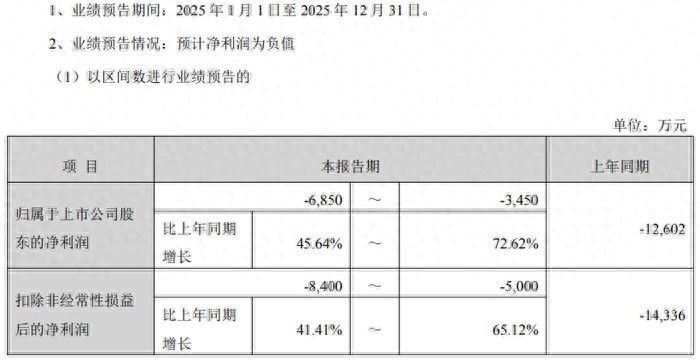 数据显示,公司归属于上市公司股东的净利润预计为 - 6850 万元至 - 3450 万元,较上年同期的 - 12602 万元,同比增长 45.64% 至 72.62%;扣除非经常性损益后的净利润预计为 - 8400 万元至 - 5000 万元,较上年同期的 - 14336 万元,同比增长 41.41% 至 65.12%。